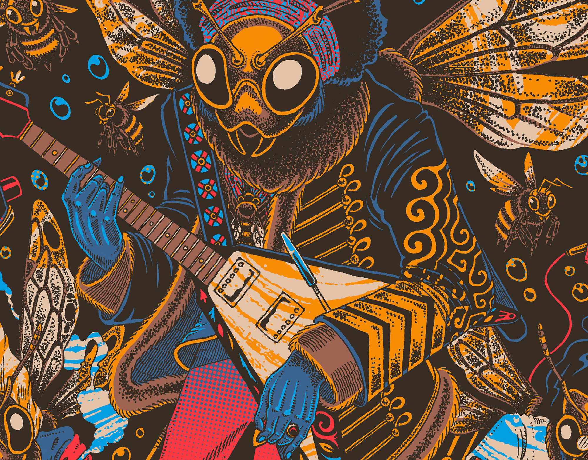 Institutional poster promoting the "Hand Made" pedal factory for guitars, Betetronics, California, USA. In the illustration I represented 4 world rock legends, transmuted into mutant bees: Jimi Hendrix, John Lennon, Kurt Cobain & BB King, respectively from top to bottom.