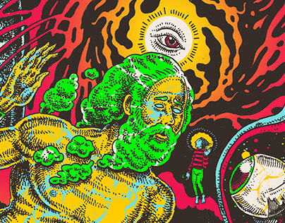 O encontro filosofal psico-físico entre Rabindranath e o vagabundo iluminado é retratado nesta ilustração onde é apresentada a tour da banda TAGORE pelo interior de São Paulo-Brasil.