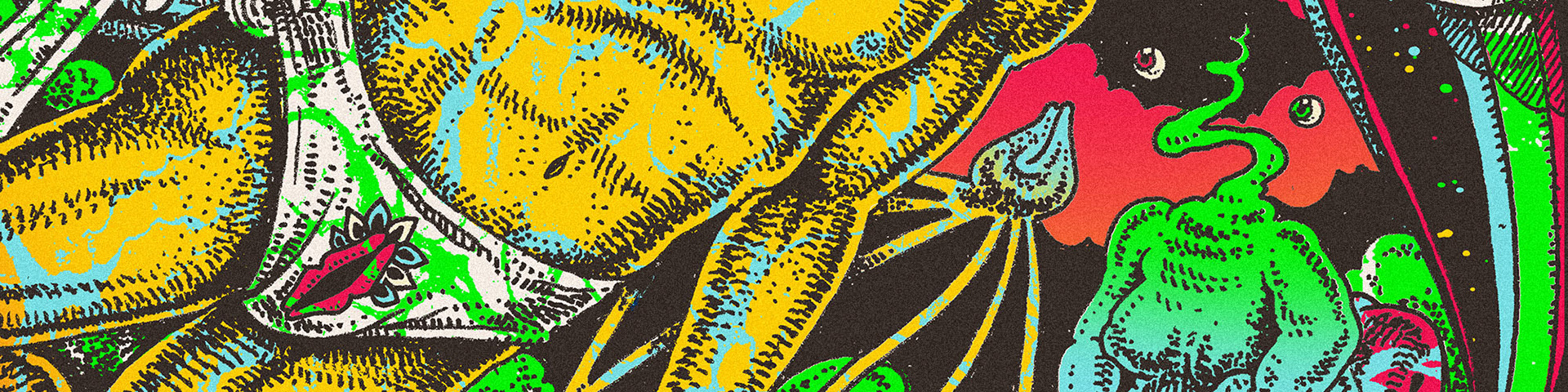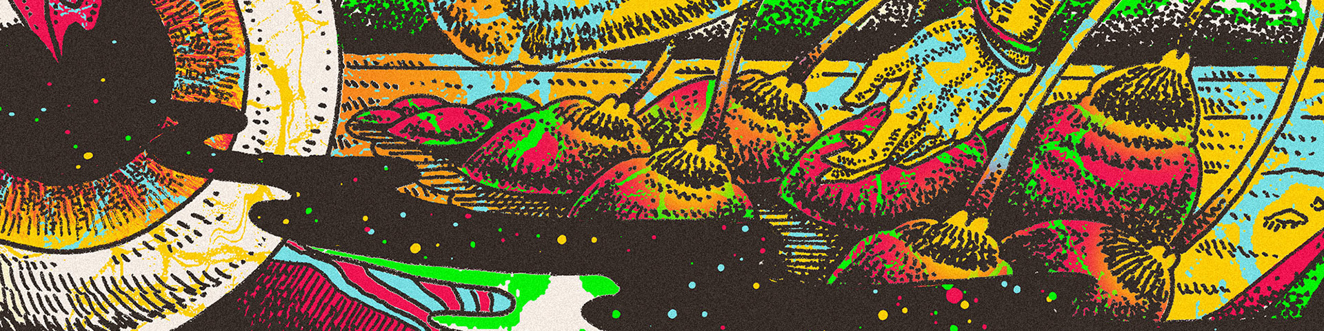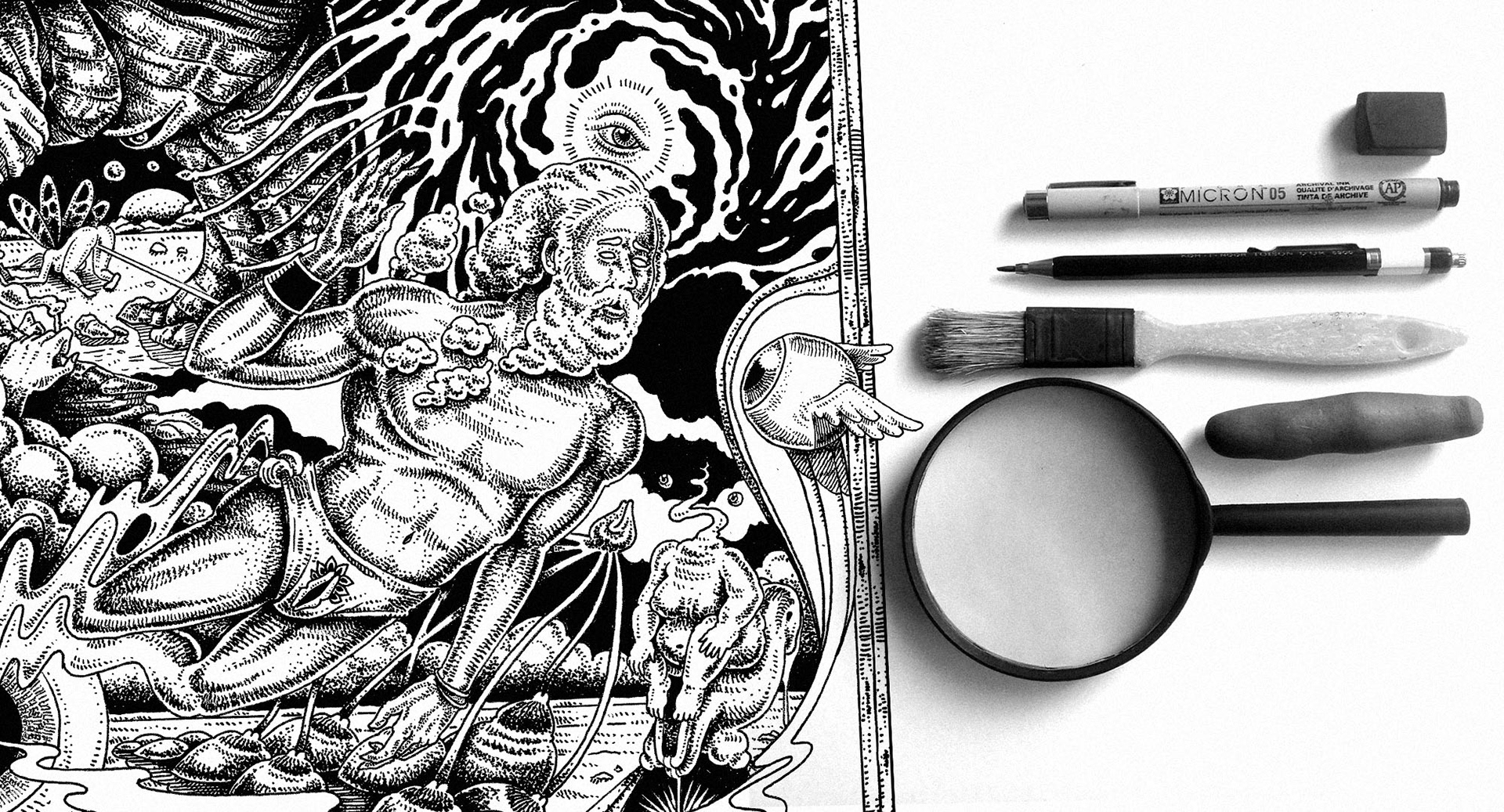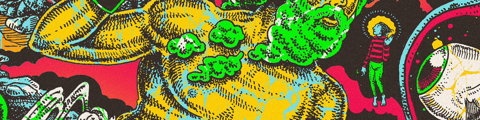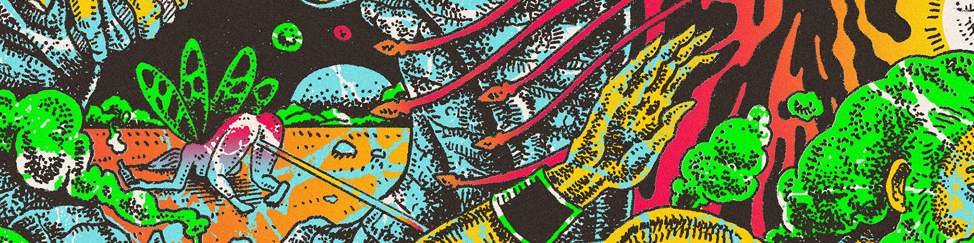 O encontro filosofal psico-físico entre Rabindranath Tagore e o vagabundo iluminado. Esta ilustração apresenta a tour da banda TAGORE pelo interior de São Paulo-Brasil.
